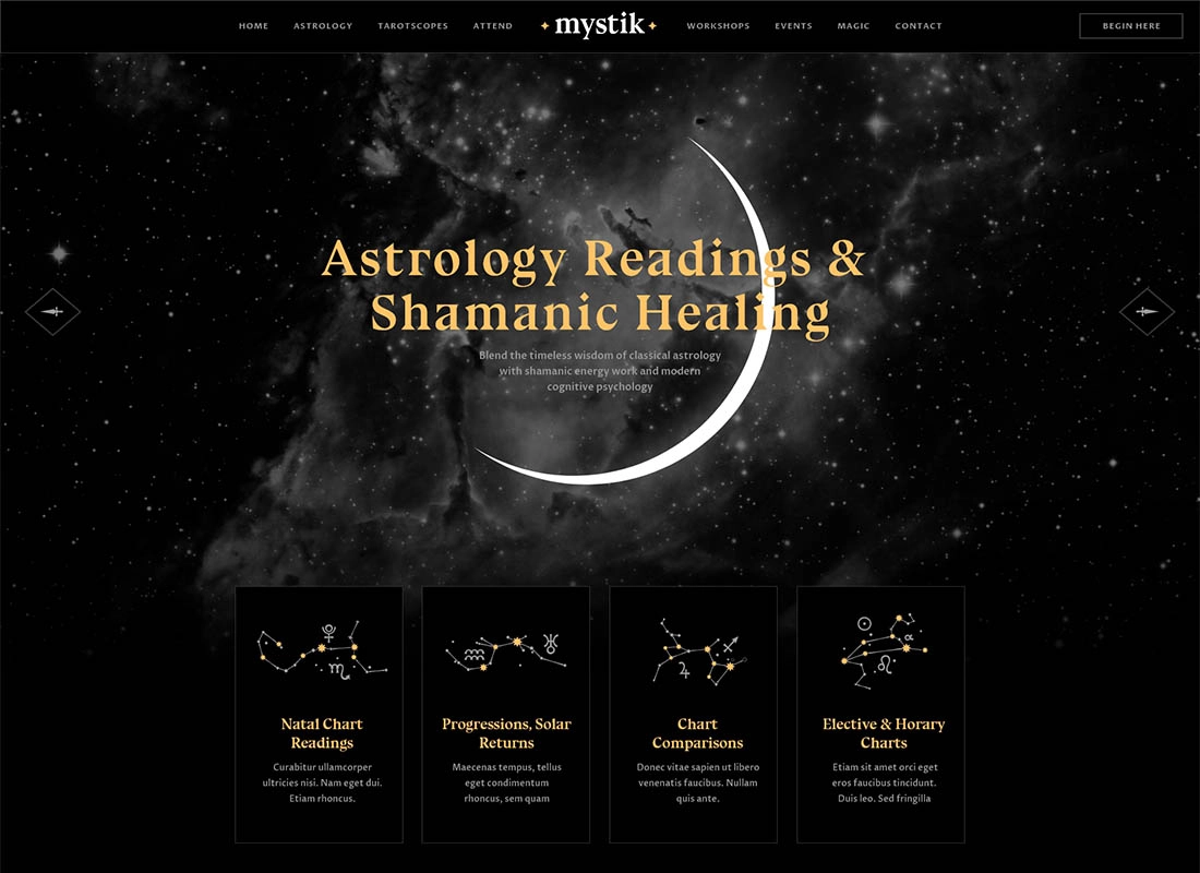Mystik is an original, contemporary theme created for websites that deal in astrology, numerology, fortune telling, tarot, meditation and other magic-related resources. Its beautiful visual design is engaging and extremely flexible. Compatible with Elementor, it allows you to easily change the look of your site in a user-friendly drag & drop interface.