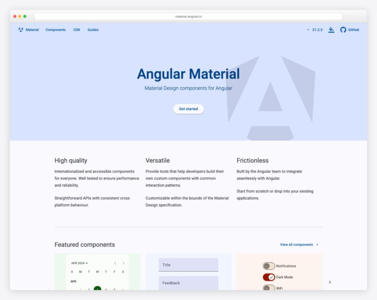 The library is deeply integrated with Angular’s architecture. Components use Angular’s CDK (Component Dev Kit) as a foundation, support Angular’s forms system natively, and work seamlessly with Angular’s animation and routing modules. Theming is built on a powerful SCSS system that lets you create custom themes with consistent typography, color, and density settings. Angular Material also supports the newer Material 3 (Material You) design tokens.