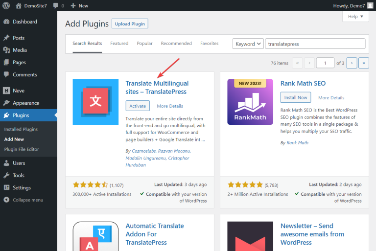 Open your WordPress dashboard and go to Plugins > Add New and upload and activate the plugin. Alternatively, you can go to Plugins > Add New and insert “TranslatePress” into the search box. Then proceed to install and activate the plugin on your WordPress website.