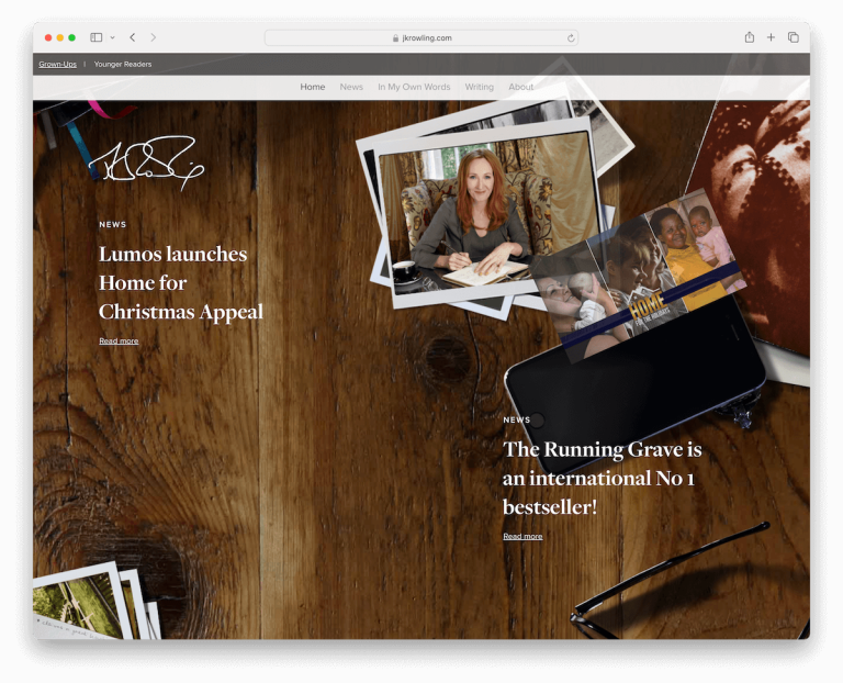 J.K. Rowling’s website, designed using WordPress, captivates with its split-screen homepage: the left side highlights her main site while the right showcases “Stories.”