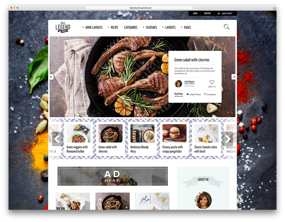 This theme also lets you monetize your recipe-sharing website by allowing you to add advertisements. (Start banking.)