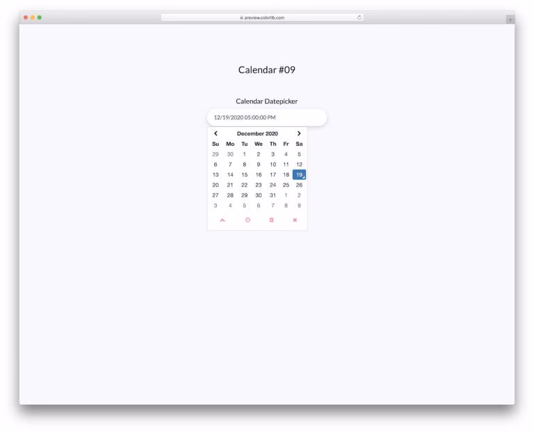 When you click on the calendar icon, the datepicker appears. Although this datepicker example does not highlight the current date, it looks very simple and powerful.