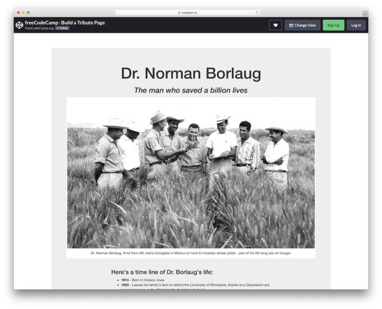 By default, it features a biography/timeline of Dr. Norman Borlaug, but you can alter it to some other person or even go entirely against the grain.