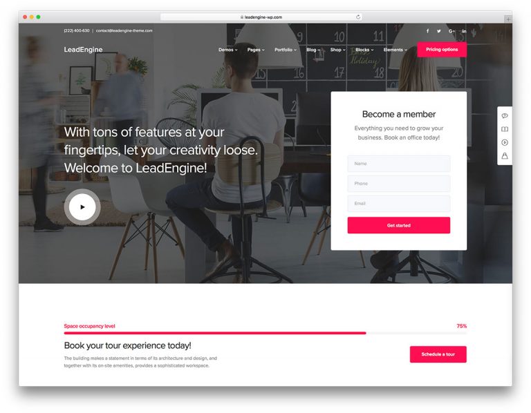 LeadEngine is a smart, flexible and responsive coworking WordPress multipurpose theme.