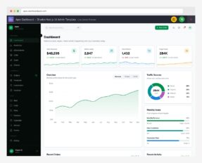 The 75+ analytics cards are specifically designed for e-commerce metrics — revenue, orders, conversion rate, average order value, top products, customer acquisition, and inventory levels. The free version provides a solid foundation with basic dashboard pages, while the premium version unlocks the full e-commerce module with order management workflows, product CRUD, and invoice generation. ThemeSelection’s developer-focused approach means clean code, proper documentation, and a straightforward customization process. The multi-framework availability (Bootstrap, Laravel, ASP.NET, Next.js) covers the most popular server-side and client-side stacks.