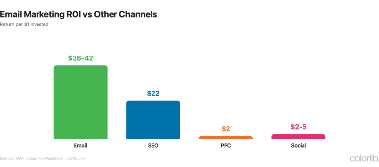 - Email marketing ROI: $36-42 per $1 spent (Litmus)