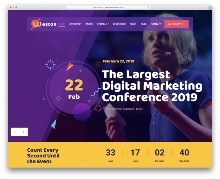 Weston is a versatile and highly adaptive event planner WordPress theme with loads of pre-defined layouts and elements. It comes with six main demos and five additional header styles.