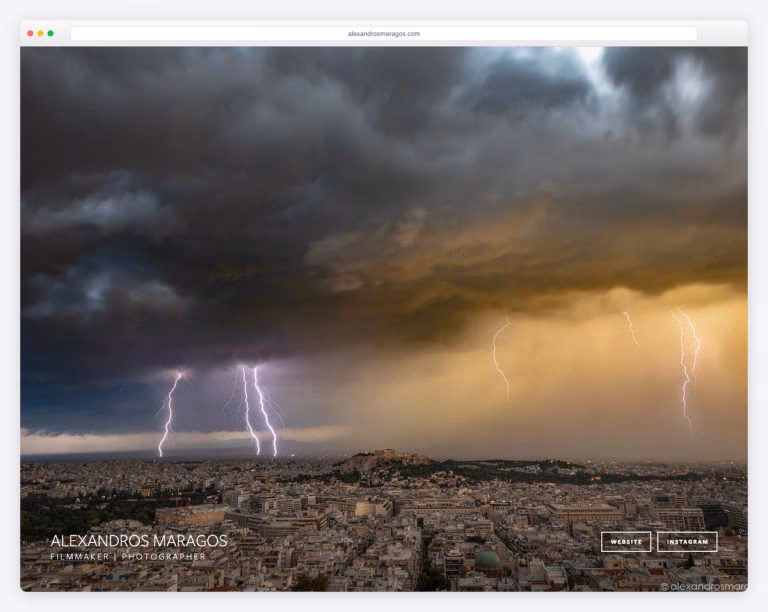 What stands out: The dark, atmospheric design creates a bold visual identity that perfectly suits Alexandros Maragos’s brand.