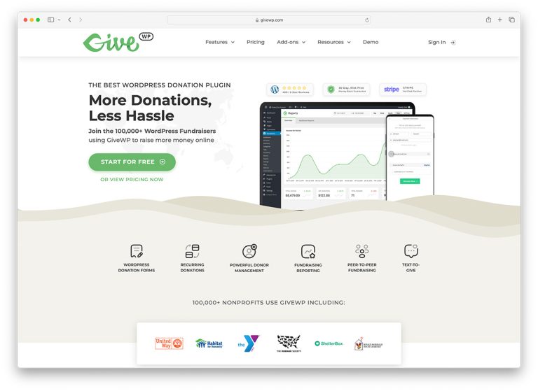 GiveWP has proven to be the most popular WordPress plugin for collecting donations, with over 100,000 users worldwide. It has more features than all other plugins combined, but it is not a bloated tool because most of the functionality comes via extensions that you can install only when you need them.