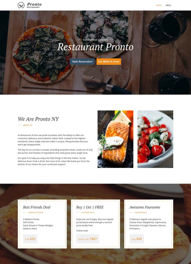 If you take into account the optional menu publishing and online ordering features, then this theme is even more appealing. Thanks to these optional extras, you can start taking bookings and reservations online. You can also configure your website to accept and manage online orders and collect payments through the GloriaFood service integration.