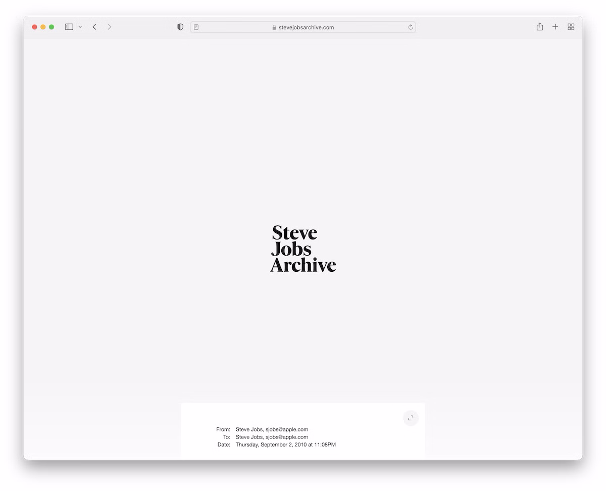 The Steve Jobs Archive is a minimalist, timeline-style website featuring a basic header and footer. The timeline elements have a hover effect that highlights the one you view and starts playing a thumbnail video.