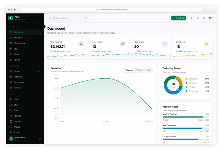 The most comprehensive Laravel admin dashboard available, with 30+ pages built on Laravel 13, Inertia.js 3, React 19, TypeScript, and Tailwind CSS v4. Full backend with Eloquent ORM, Spatie role-based access control, Fortify authentication with 2FA, and CRUD operations for orders, products, customers, and invoices. Includes 5 dashboard views, Kanban, Calendar, Charts, and a live theme customizer with 6 color presets.
