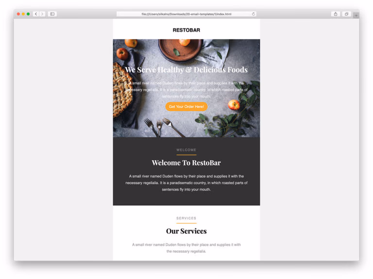 If you run a restaurant, this is the everyday MailChimp email template you can use to send out newsletters. It is a full-blown layout that you can use for various needs. From sending out a full introduction of your fresh new restaurant or food business opening to regular weekly newsletters, pushing special deals and events, whatever you need, capture their attention with Colorlib Email v1. Whether you run a pizzeria, a steak house or any other foods and drinks location, even fast food, this design is ready and set for you to go live with it.