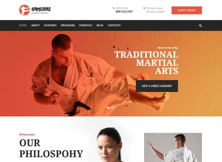 The best martial arts WordPress theme is Samurari. It is the most customizable theme, with a drag-and-drop page builder and multiple ready-made demo websites that you can use as a base to create your own.