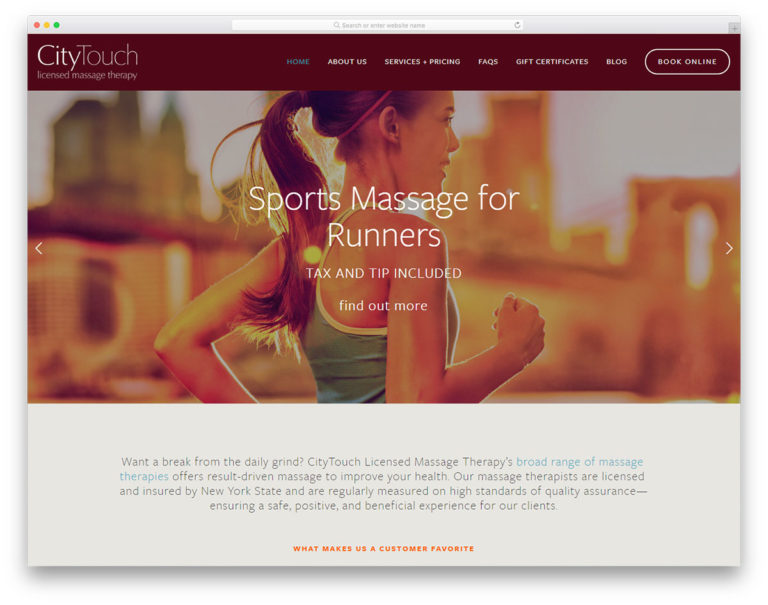 Upon building your website, always ensure that the content is engaging. You can kindle a visitor’s interest and establish your brand. City Touch NYC’s exceptional design will be a useful inspiration for massage therapists and entrepreneurs. The website comes with essential pages for a massage therapy business. It welcomes visitors with striking images on the hero header using a slider and primary CTA. Other contents look great with a white background too.