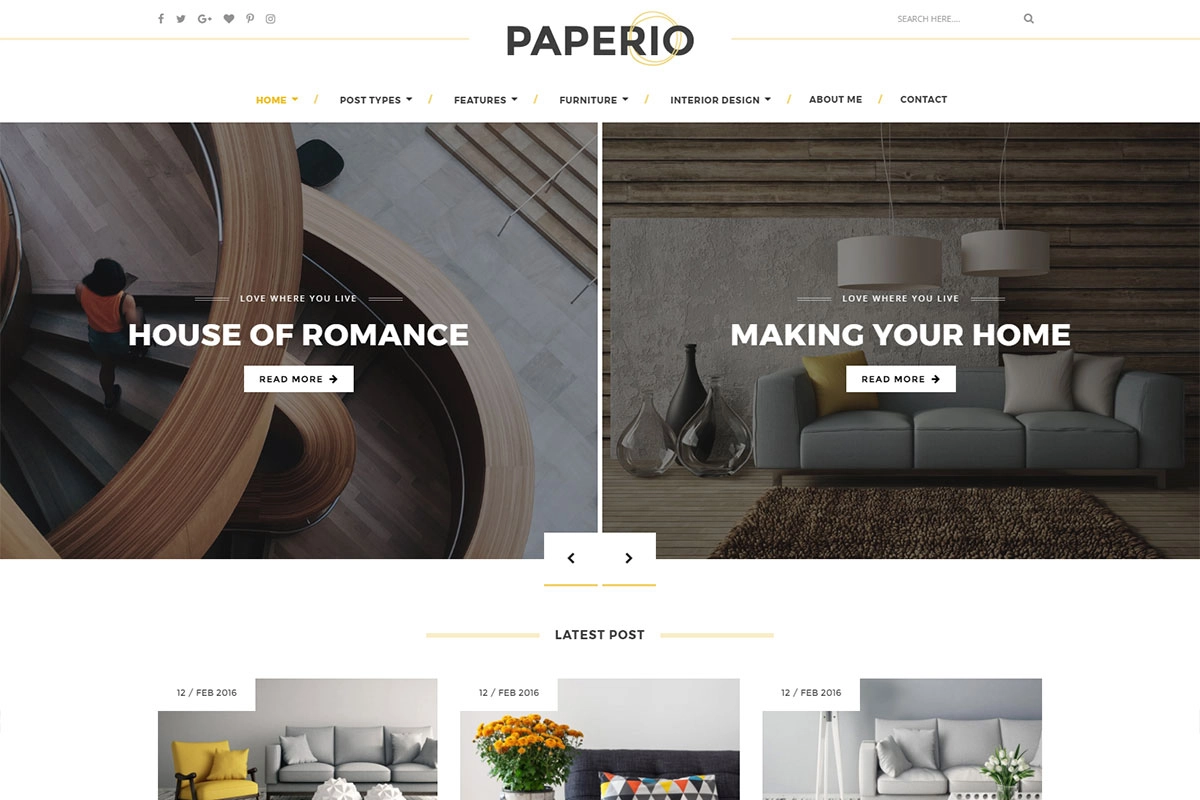 Creating a blog about interior design or home décor? If so, the so-called default Paperio demo has been built just for you. The full-width layout of this demo gives you a perfect opportunity to grab the attention of your visitors, as soon as they arrive at your website.