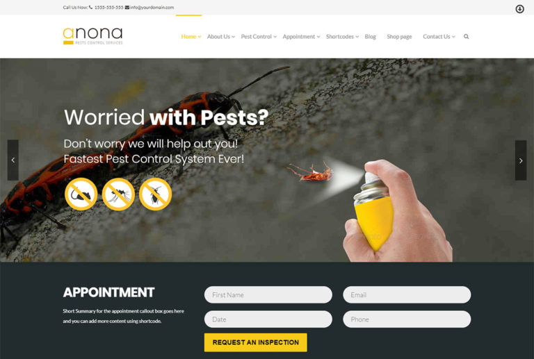 Anona also has 5 headers, unlimited sidebars, a sticky menu, testimonials, and widgetized footer. Meanwhile, its compatibility with the WooCommerce plugin allows you to sell pest control products.