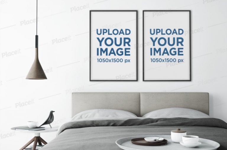 Let’s move things forward with a picture frame mockup that features two prints hanging on a wall in a bedroom. The minimalist style will shine extra on your designs and images, making them pop. You can upload two different designs separately, as well as change the color of both posters individually. You undergo a process that will seem super simplistic, yet the outcome will be very professional. You do not always need to start from scratch and pay a hefty fee when you can go with a Placeit platform and make an immediate difference. Witness it yourself, and you will not want to turn back.