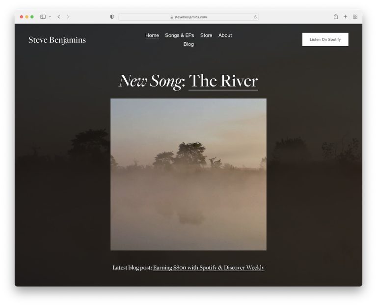 Steve Benjamins has a bold, dark web design, with the hero section promoting the latest song. The header features all the necessary quick menu links and a call-to-action (CTA) button to listen to on Spotify.