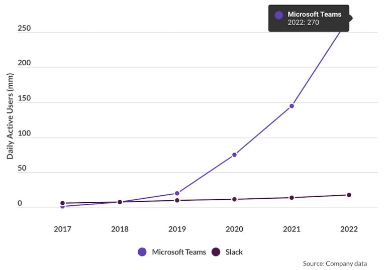 Microsoft Teams surpassed Slack in 2018 and had exponential growth ever since. Meanwhile, Slack has a mellower but steady growth but ended far behind Microsoft Teams.