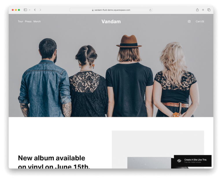 Vandam is a Squarespace template designed to make your music shine online. It begins with a large hero image that immediately grabs attention.