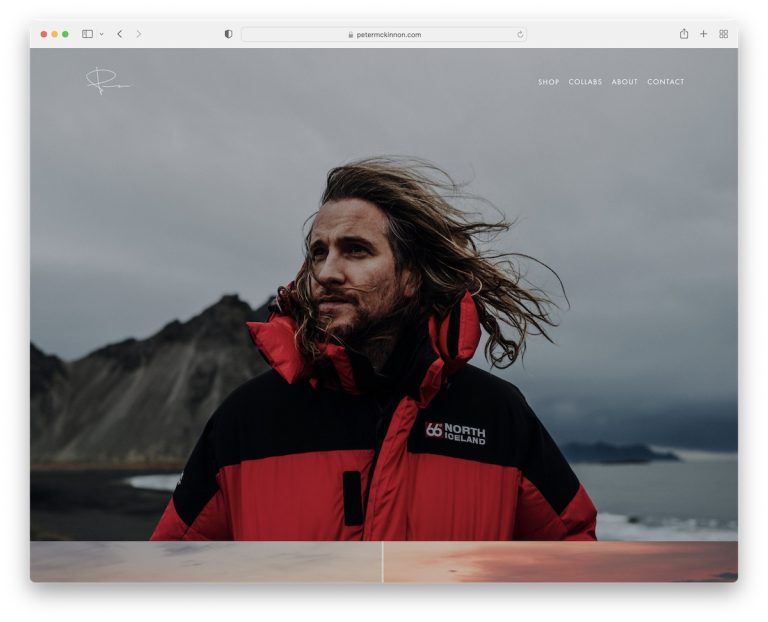 The Hearnes is a superb Squarespace photography example with a full-screen hero image with a parallax effect. It has a top-bar notification and a 100% transparent header, so the background doesn’t get in the way.