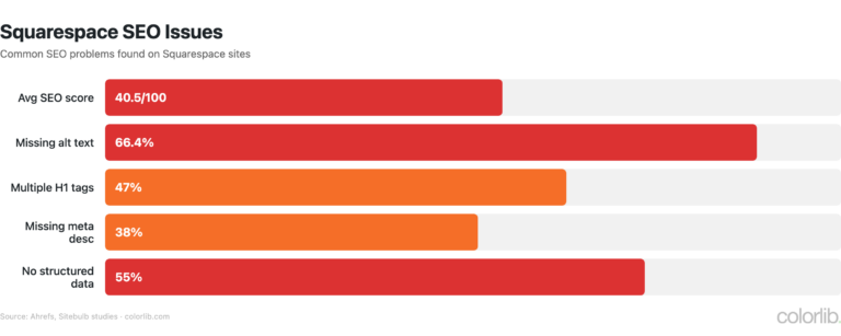 - SEO is a weak point. The 40.5/100 average SEO score, 66.4% missing alt text, and limited technical SEO controls remain Squarespace’s biggest limitation.