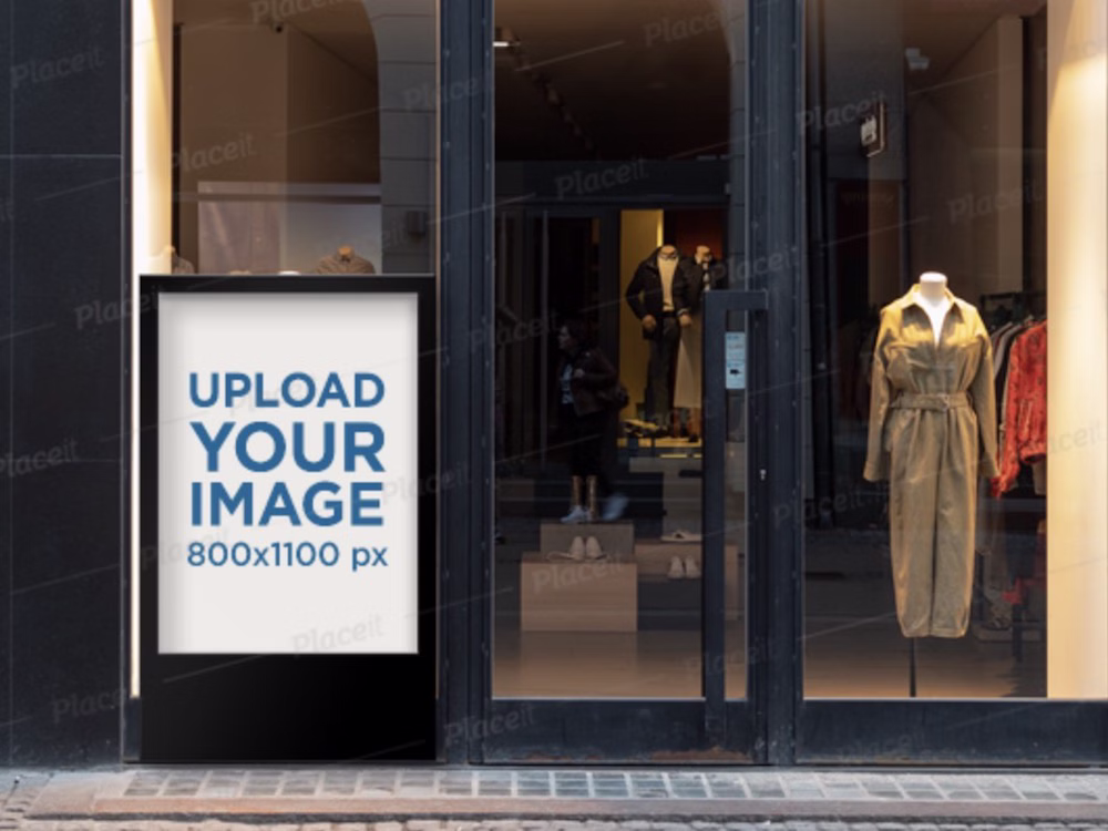 Another terrific storefront mockup of a vertical banner on a window store. Since this is a fashion store, you will want to use a design that fits the industry and not go with something entirely off. Whether you have a new line coming or a big sale, this template will help you create a life-like presentation speedily. If you have the artwork ready, all it takes is to upload it to Placeit and let the platform do all the heavy lifting for you. It is just as easy as it sounds, as you do not need any design knowledge or Photoshop or other software.