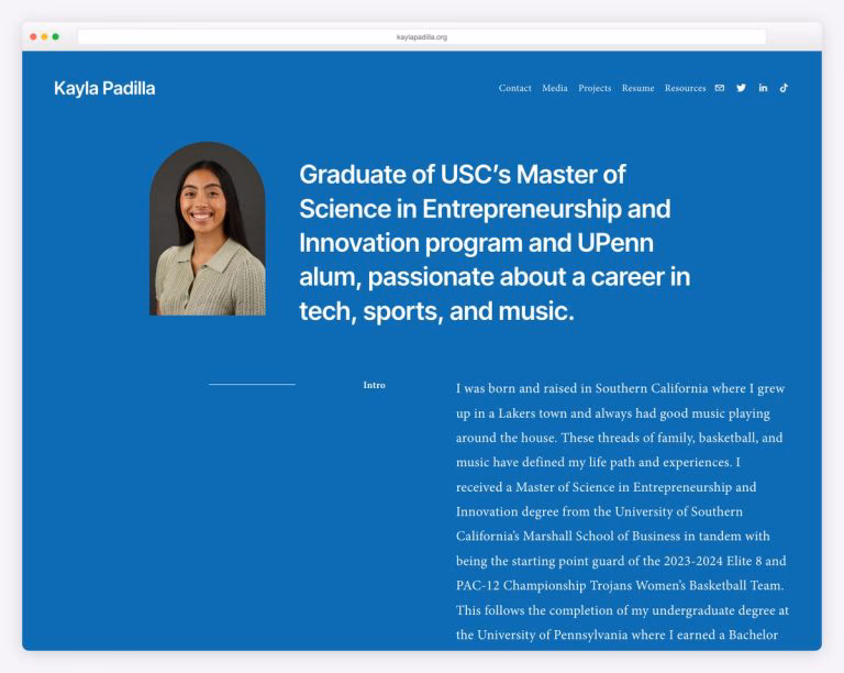 Former college basketball player showcasing finance, tech, sports, and music projects alongside academic journey.