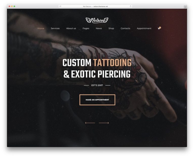 Nelson is a modern and trendy tattoo salon WordPress theme to employ out of the box. But you can keep the default settings, enrich it with your details and other custom content and be ready in a snap.