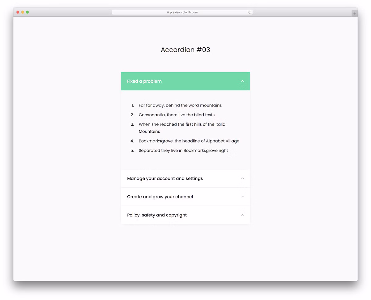 Template Details Author: Colorlib Released: 2025 License: CC BY 3.0 Description When integrating accordions to your website or app, use this free and clean Bootstrap template and keep things simple. You can use it to present additional text or answers in a convenient way. Download Preview