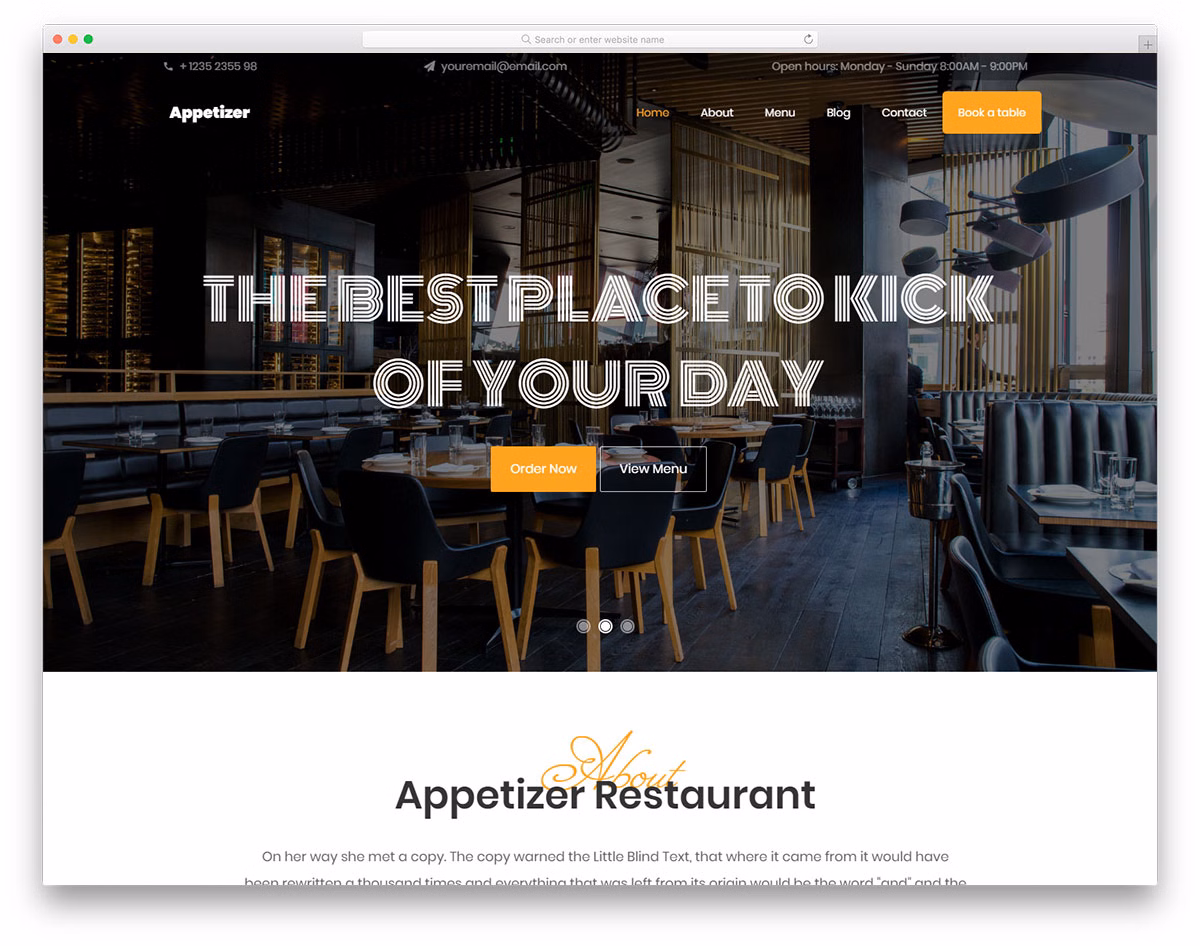 Appetizer is a delicious free food and drinks website template for restaurants, cafes and catering businesses. It is a multi-functional site canvas with striking, modern and mouthwatering web design. If you would like to create a strong first impression on your visitors, Appetizer is the one tool you should take to your benefit. It is just a click away, ready and set for you to put it into play. Presenting your delicious dishes, cocktails and other treats happens much quicker with Appetizer.