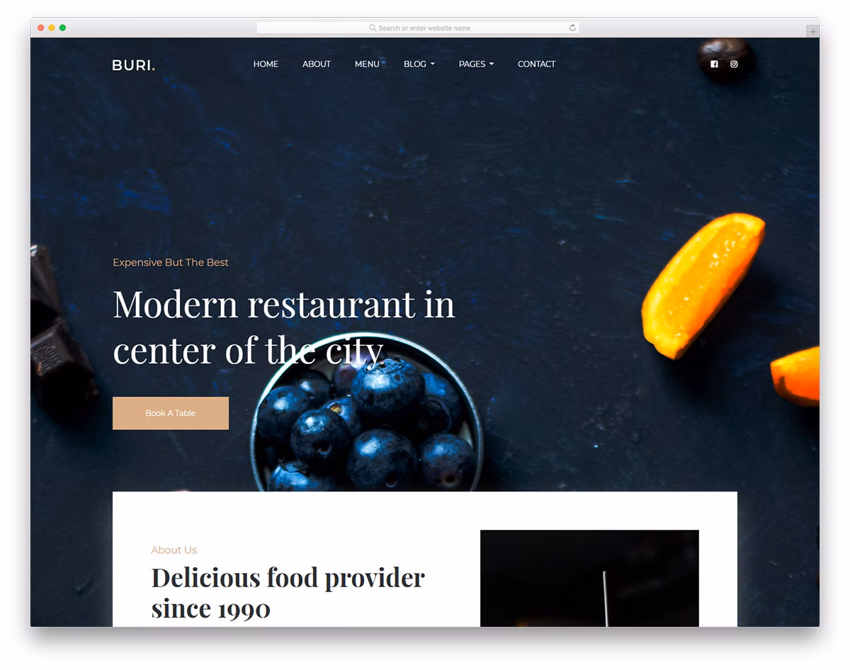 What’s more, Buri comes with sticky navigation, drop-down menu, video support, testimonials slider and social media icons. The included contact page also contains Google Maps and a functional form – nope, you do not have to build one yourself. Food menu and blog section are also part of the deal to offer your fans something more.
