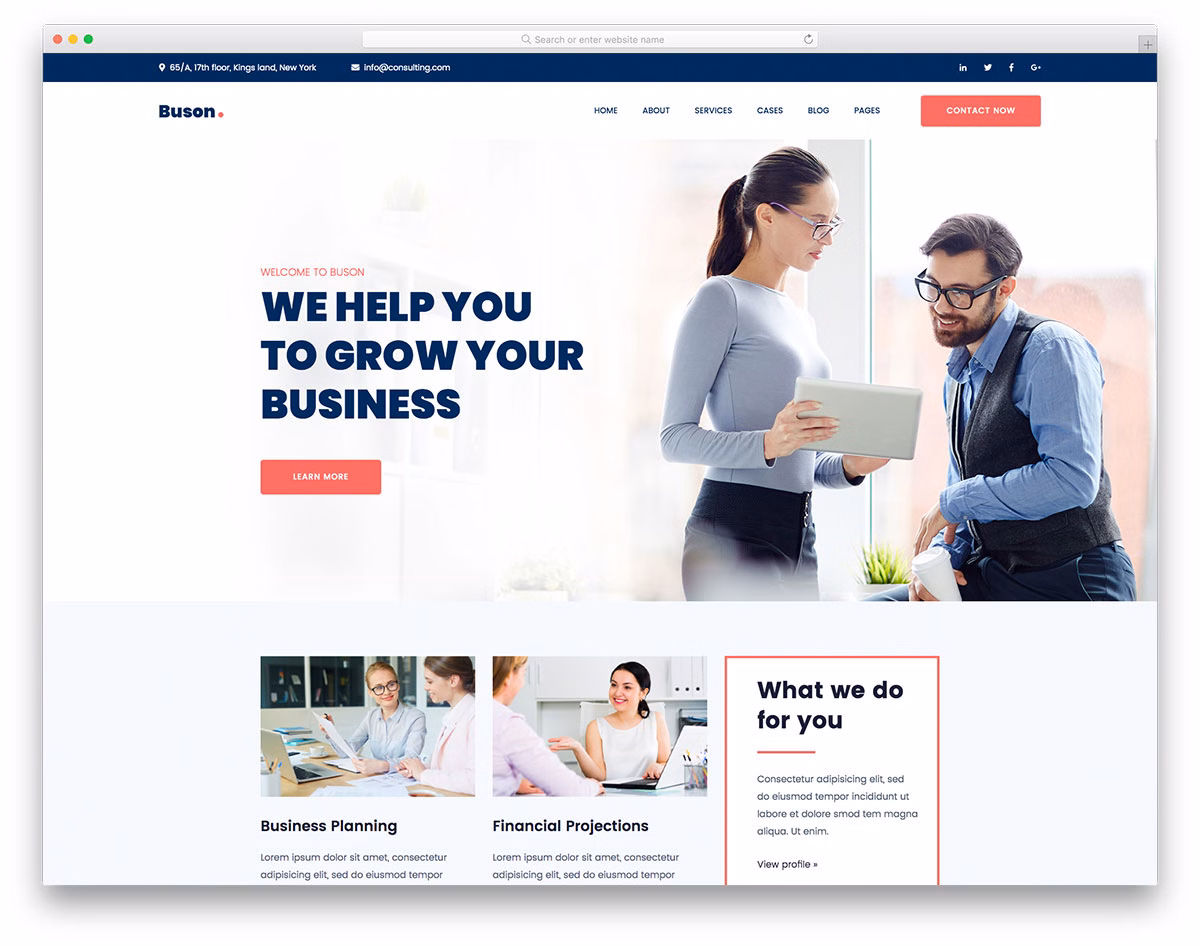 Some of the features of Buson are slider, call-to-actions, sticky navigation, drop-down menu, back to top button and Googe Maps integration. There is also a blog that you can use for content marketing and bring in even more potential clients. With Buson, you do not need to start building a business consulting website from scratch anymore. Let this HTML template help you on your journey to success.