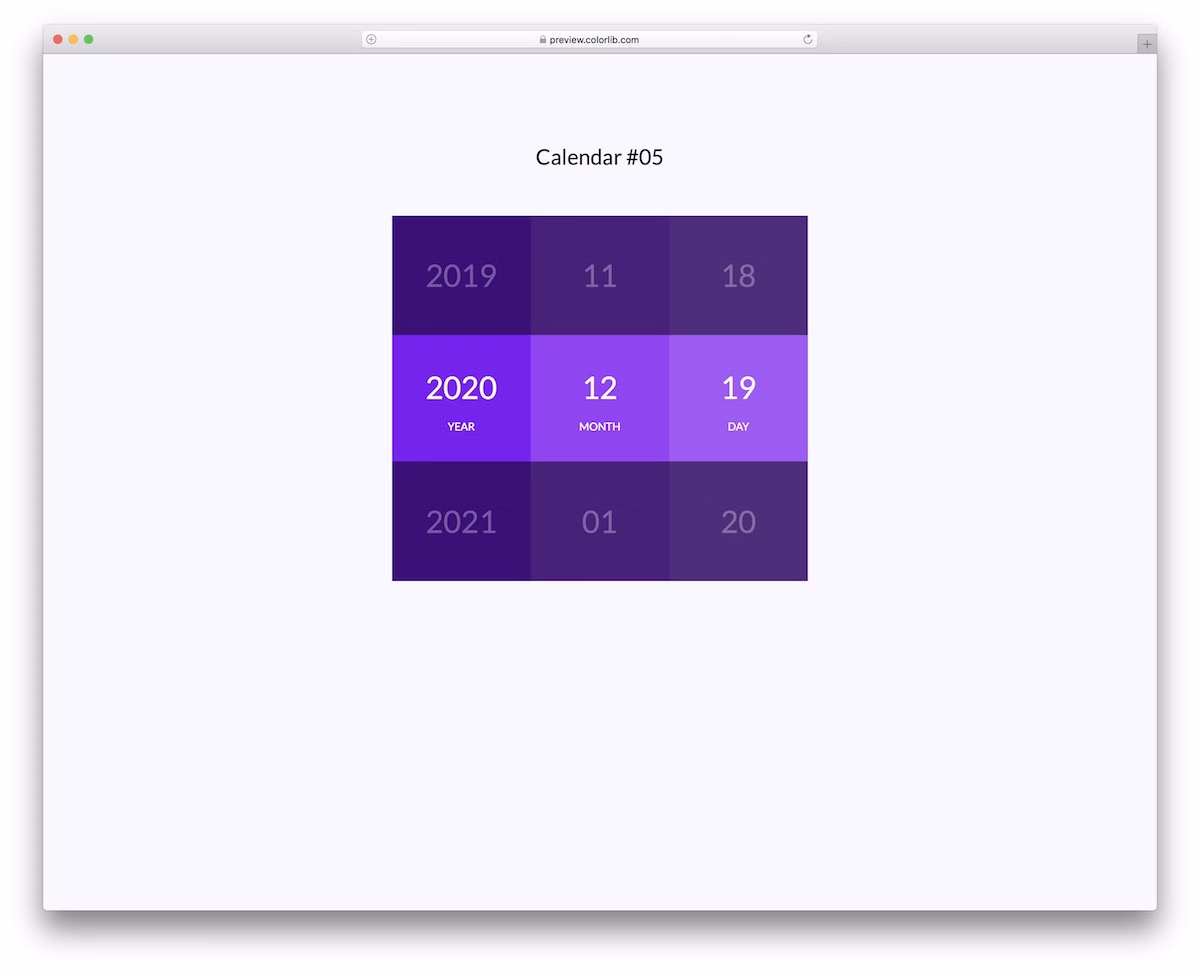 Instead of following the traditional look, get your hands on this free grid calendar template based on Bootstrap. It features the year, month and day in one row, with yesterday’s date above and tomorrow’s below.