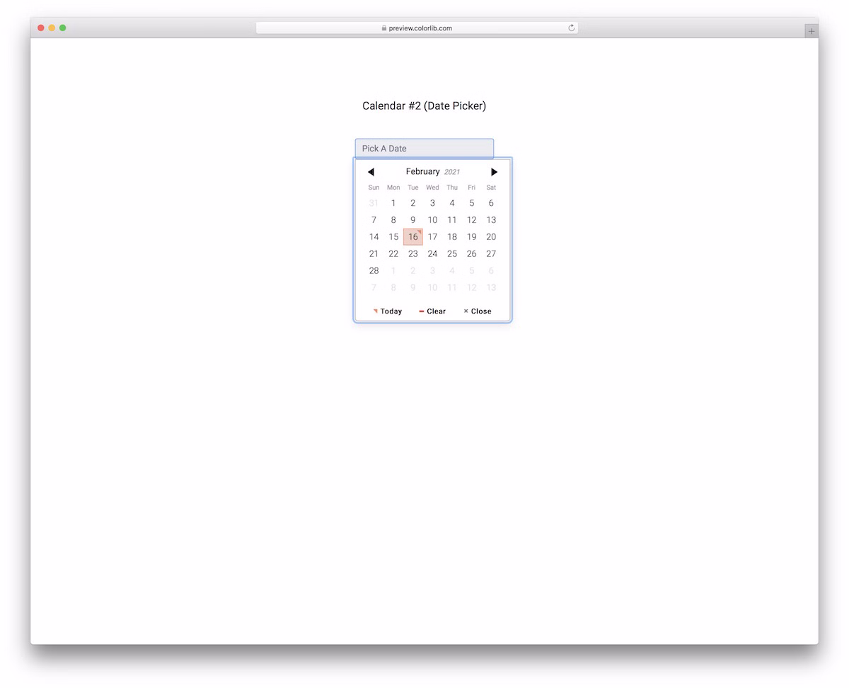A modern, simple and responsive free date picker template based on Bootstrap Framework. Along with the calendar section, the snippet also offers a shortcut for today’s date, a button to clear the selection, or close the window.