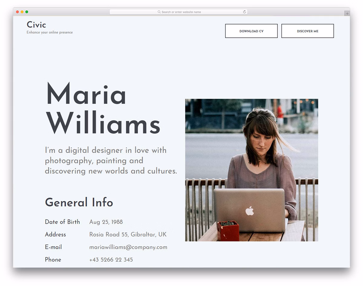 Civic has all the necessary elements of a convincing online resume page. From a quick bio to the large timeline, portfolio, skills section and an active contact form. Upload your complete CV and give everyone a chance to download it and learn even more about you.