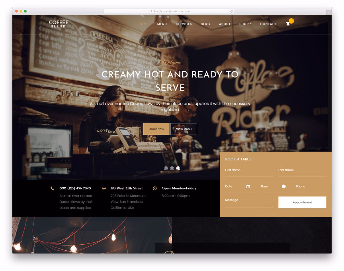 Coffee Blend is a coffee website template for nearly any coffee-based business you plan to launch or already run. It is a highly adaptive site canvas that is super simple to use. Moreover, the tool is responsive and mobile-ready, keeping pace with the latest trends and regulations in modern web and technology.