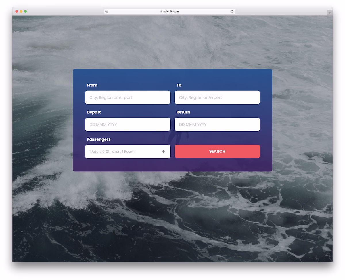 For airlines and other travel websites, here is a free flight search form featuring a drop-down selection and date pickers. Also, the transparent box beautifully integrates into your website. It is indeed fully fluid to work on mobile and desktop flawlessly.