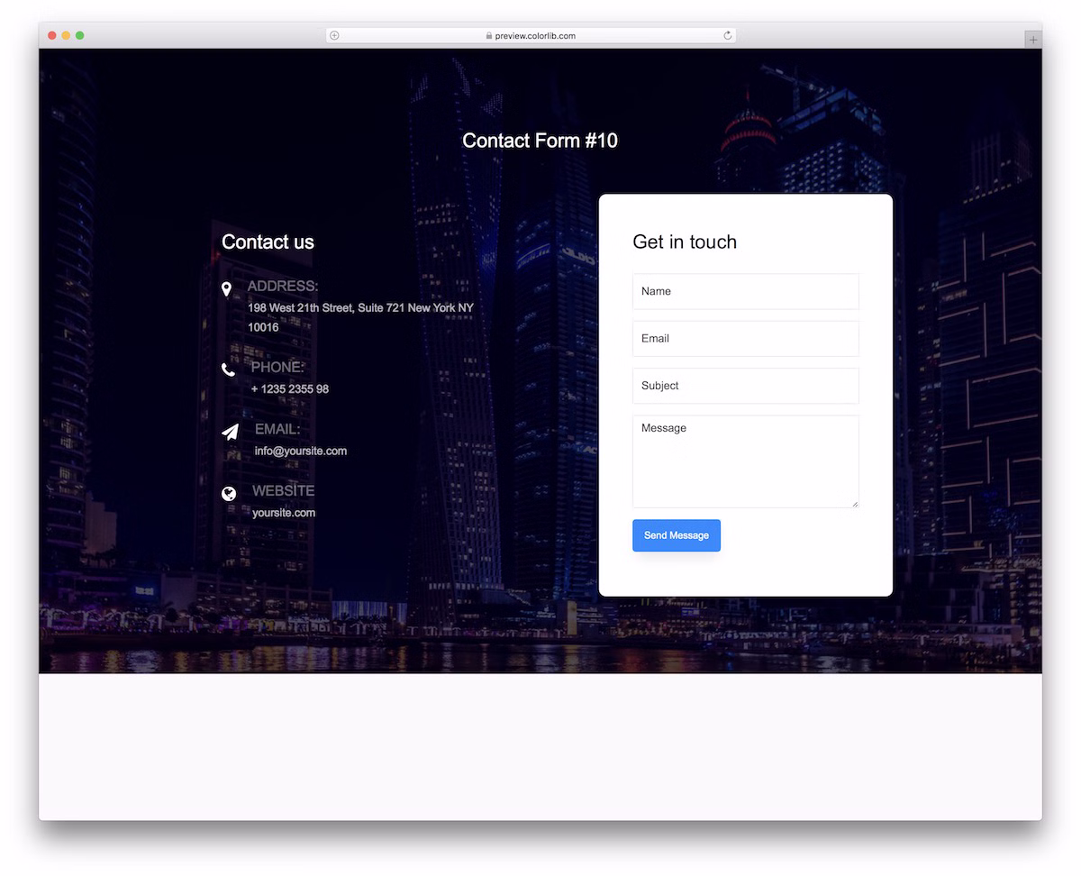 Template Details Author: Colorlib Released: 2025 License: CC BY 3.0 Description An impactful and eye-catchy free full-screen contact form template for any website or blog. It features an image background with additional contact details and form. Download Preview