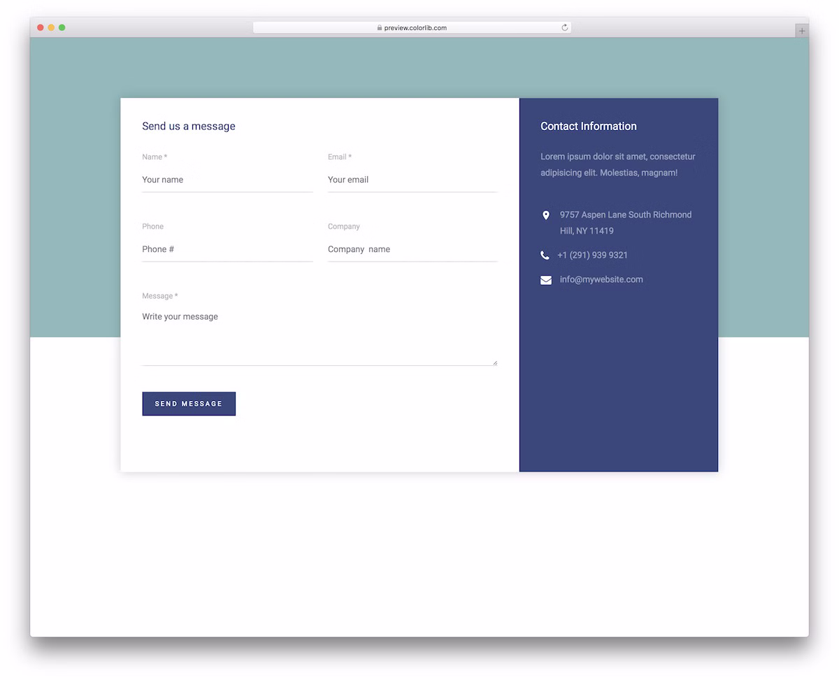Template Details Author: Colorlib Released: 2025 License: CC BY 3.0 Description A full-blown free contact form with company details template with a modern touch. The layout is responsive, working seamlessly across all popular mobile and desktop devices. Download Preview