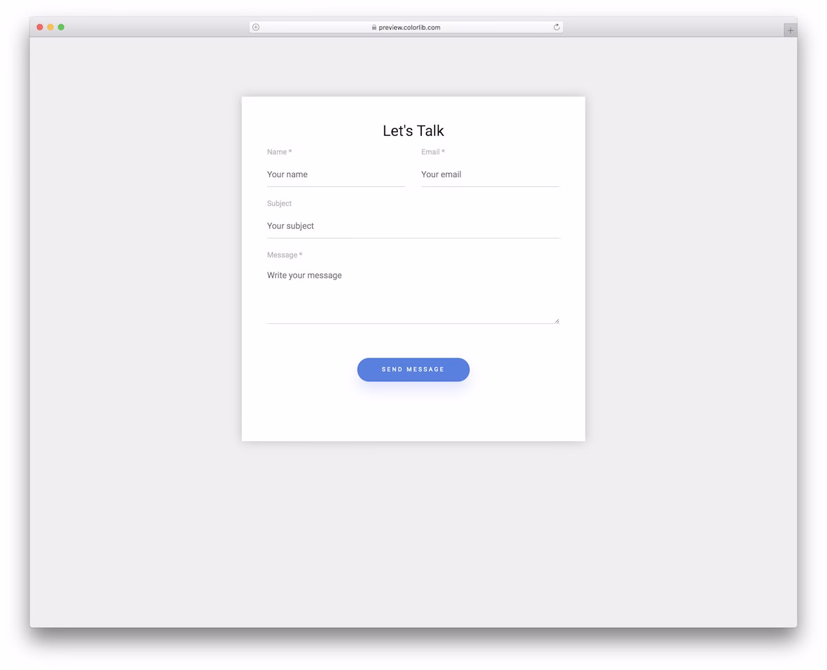 Template Details Author: Colorlib Released: 2025 License: CC BY 3.0 Description If you are unsure about the design approach, go with this free basic contact form template and win the day. Simplicity and minimalism work for everyone, regardless of the niche and industry you are in. Download Preview