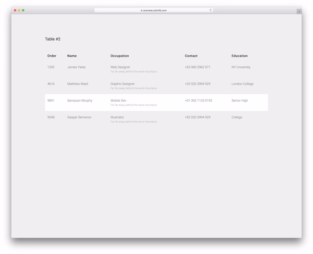 An engaging, clean and minimal free transparent table with hover effect template that uses Bootstrap Framework. With that in mind, you know the table works excellently across all devices and platforms for a great user experience.