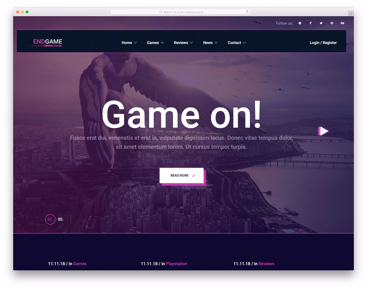Endgam is a contemporary free games website template that will help you quick-start your gaming project. It is an ideal page building tool for making gaming blogs and review websites due to the highly adaptive and fully customizable web design. Endgam is also based on Bootstrap Framework what ensures flexibility and mobile-readiness. Meaning, your final game-packed website will work seamlessly on all devices, from smartphones and up to desktop computers. Indeed, Endgam is also compatible with retina screens and modern web browsers.