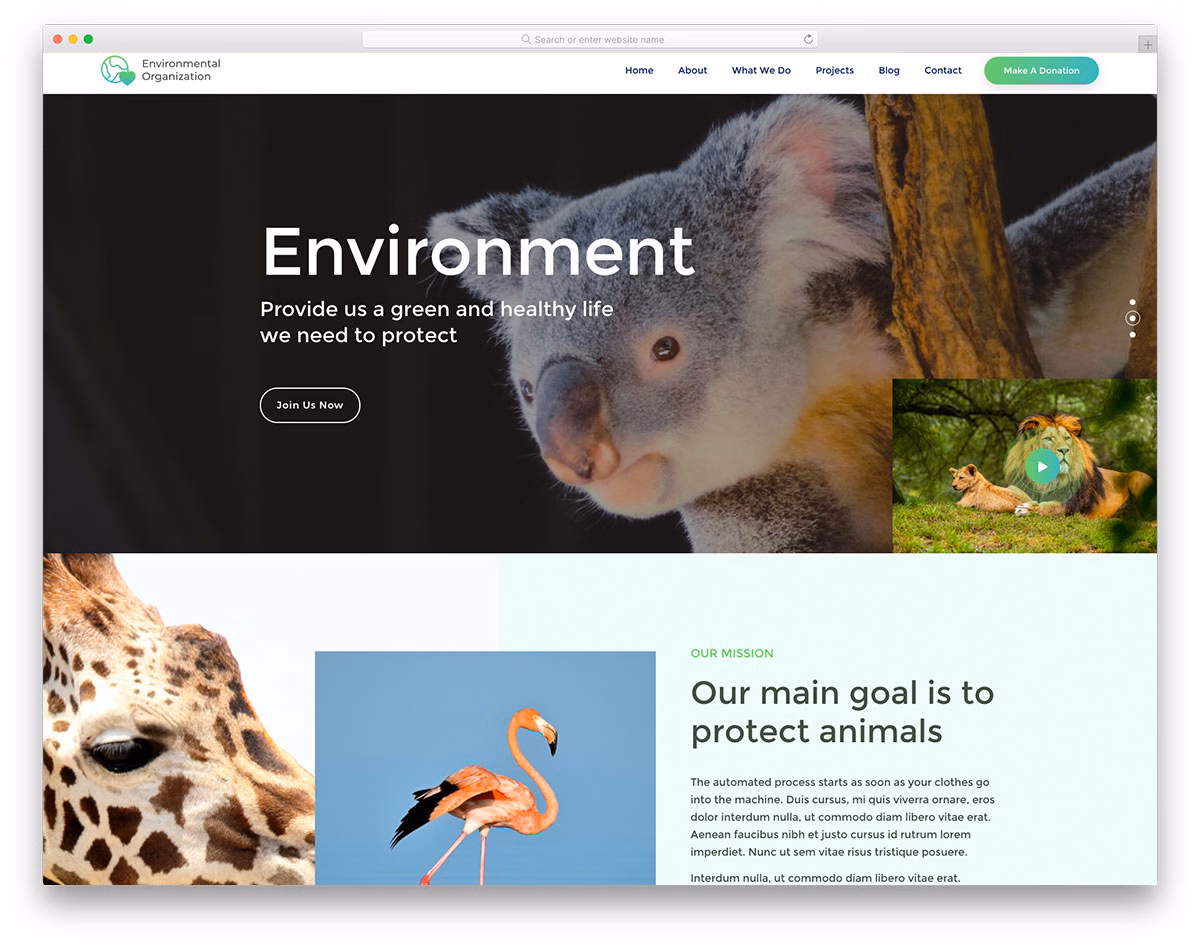 EnvironmentalOrganization is a stunning, flexible and responsive free website template solution for non-profit organizations. Even though this is an HTML template that does require coding, you will still save yourself plenty of time and effort. Feel free to go with the default look, enrich it with your content and start on the right track immediately. On the other hand, if you would like to brand and personalize EnvironmentalOrganization, you are welcome to do it. Note: to continue using it for free, you need to keep footer copyright intact.