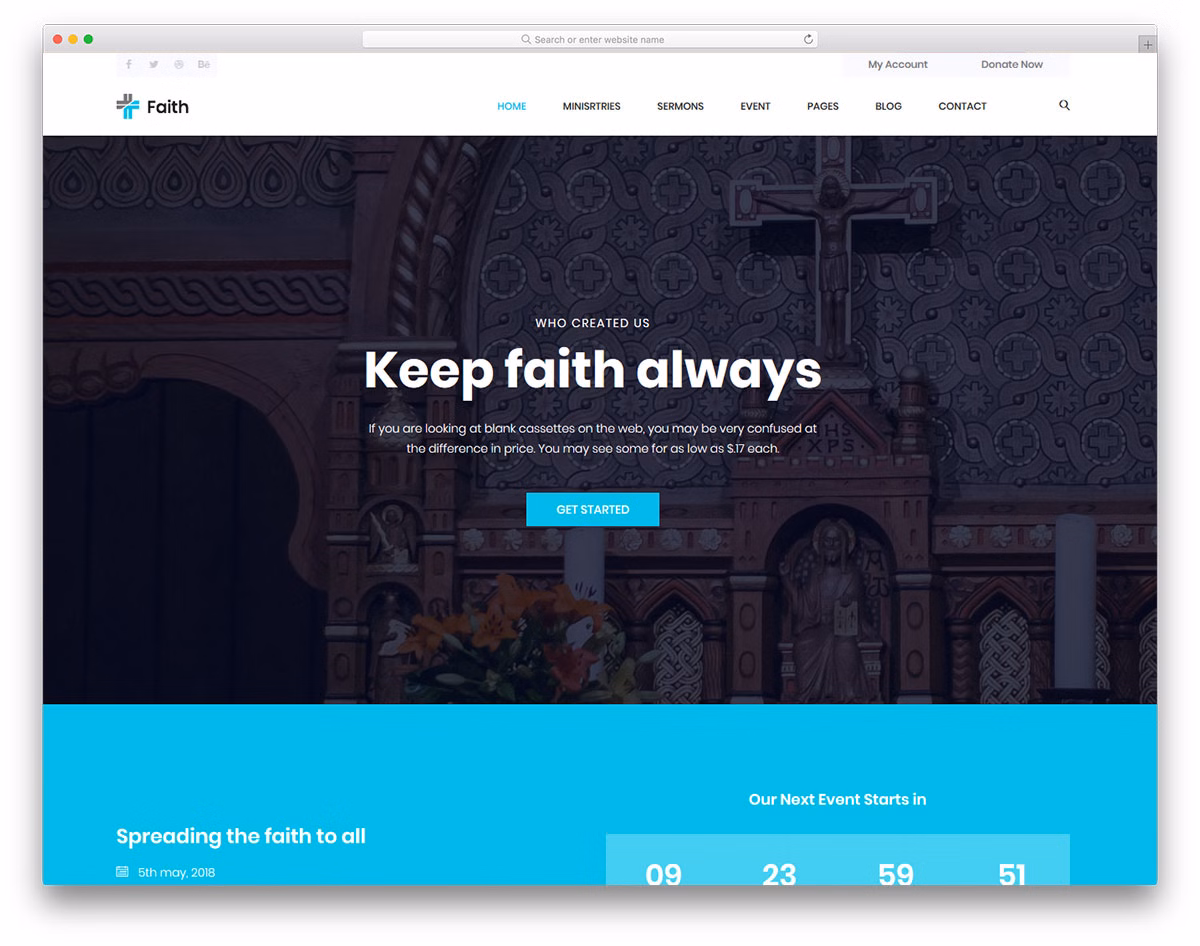 Faith has a ton of cool features like countdown timer, sermons, events section and also comes entirely ready to start a religious blog. Give back to people and show the world how unique you are. They will notice it and they will come to your next event full of joy and happiness. Start the astonishing and never-ending journey today and broaden your horizons.