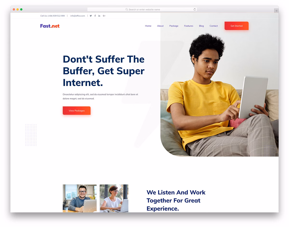 The layout of Fastnet is in harmony with all the latest trends and regulations. Everyone who lands on your website will have a blast browsing through your compelling content. Some of the traits of Fastnet contain slider, top bar, sticky menu, pricing plans, inner pages, blog, Google Maps and a contact form. Get the ball rolling now and push your internet services over and beyond.