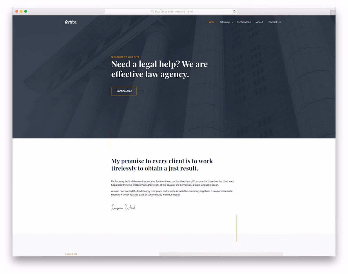 Fective is a modern and impactful law office website template to help speed up the creation of your online presence. Promote your legal services to the world via a terrific website and raise your potential. Fective is here in all its glory, with many page layouts and features to mix and match. On top of that, you can also introduce your signature touch and take things to the next level.