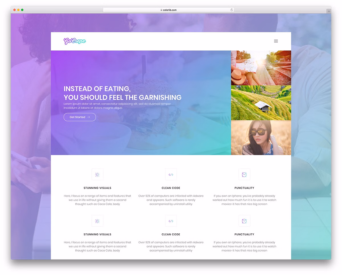 Template Details Author: Colorlib Released: January 2026 License: CC BY 3.0 Description Go Crepe is a bright and colorful free website template for your creative needs. You can use this template for mobile apps, local businesses, photography agency, digital company, media firm, SEO agency and much more. Preview Pricing Go Crepe Premium support If you need help just post a ticket and our tech guys will get back to you asap. We have a stellar support team ready to help you in no time. Template updates We are constantly improving our templates making them compatible with different scripts and adding new features. Support & Updates SINGLE – The perfect choice for a personal purchase. You will get support and updates for 1 year. MEMBERSHIP – The perfect choice for a small agency. You will get support and updates for 1 year. LIFETIME – Perfect for developers, designers, agency that have multiple clients. You will get support and updates for life. Access all templates SINGLE – You get instant access to the current HTML templates plus all templates releases while you are a member. MEMBERSHIP – You get instant access to the current HTML templates plus all templates releases while you are a member. LIFETIME – You get instant access to all our current HTML templates plus all templates releases for life. Single $19 Premium support Template updates For 1 year Access all templates Membership $129 Premium support Template updates For 1 year For 1 year Lifetime $349 Premium support Template updates For life For life