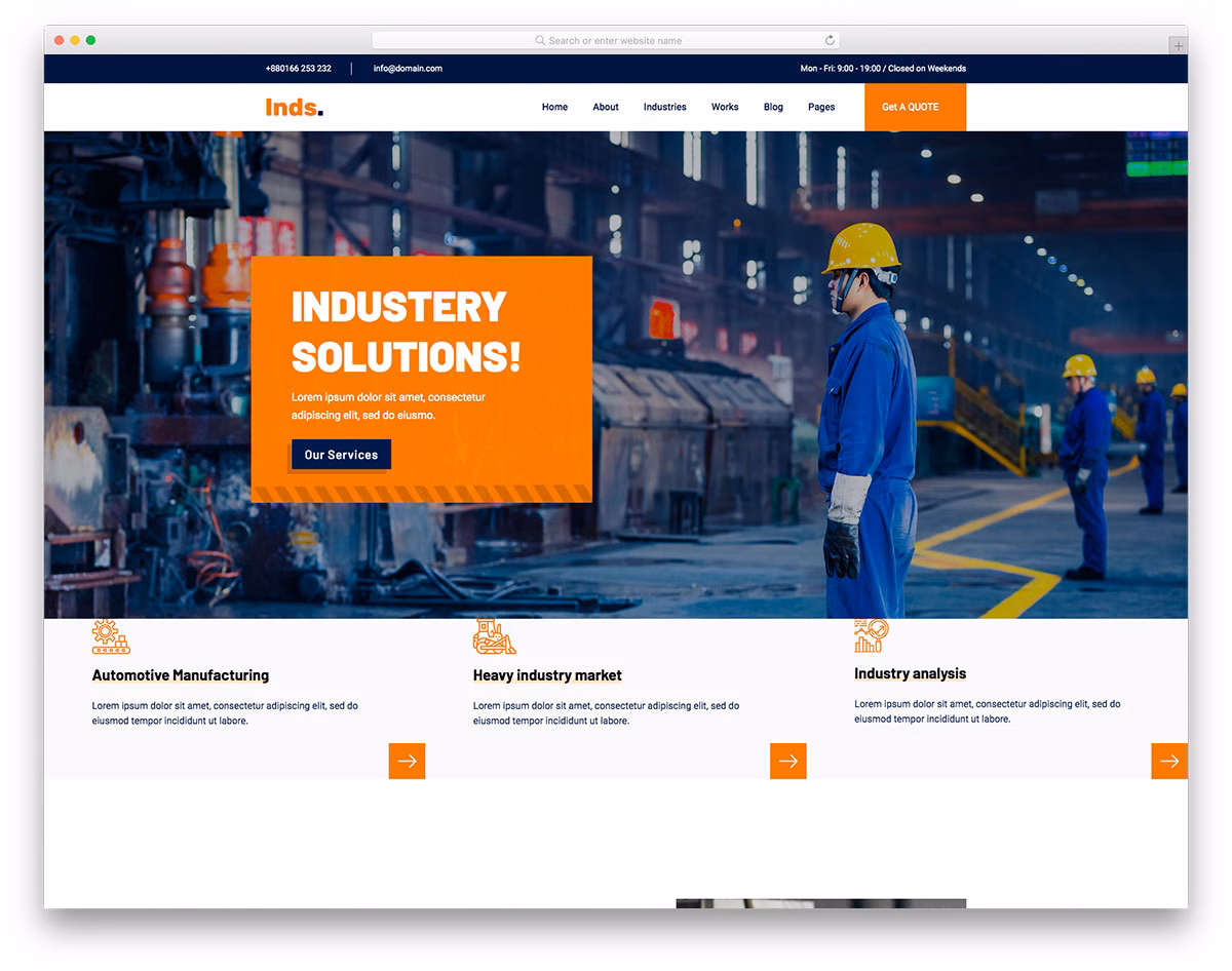 Inds is a professional and sophisticated free industry website template design with an array of amenities to take to your advantage. Although the tool costs you nothing, you can expect to bring into being a very premium-like outcome. And if you decide to go with the out-of-the-box look, you save yourself even more, time and effort. Thanks to the terrific design, Inds caters to numerous intentions quickly and effortlessly.